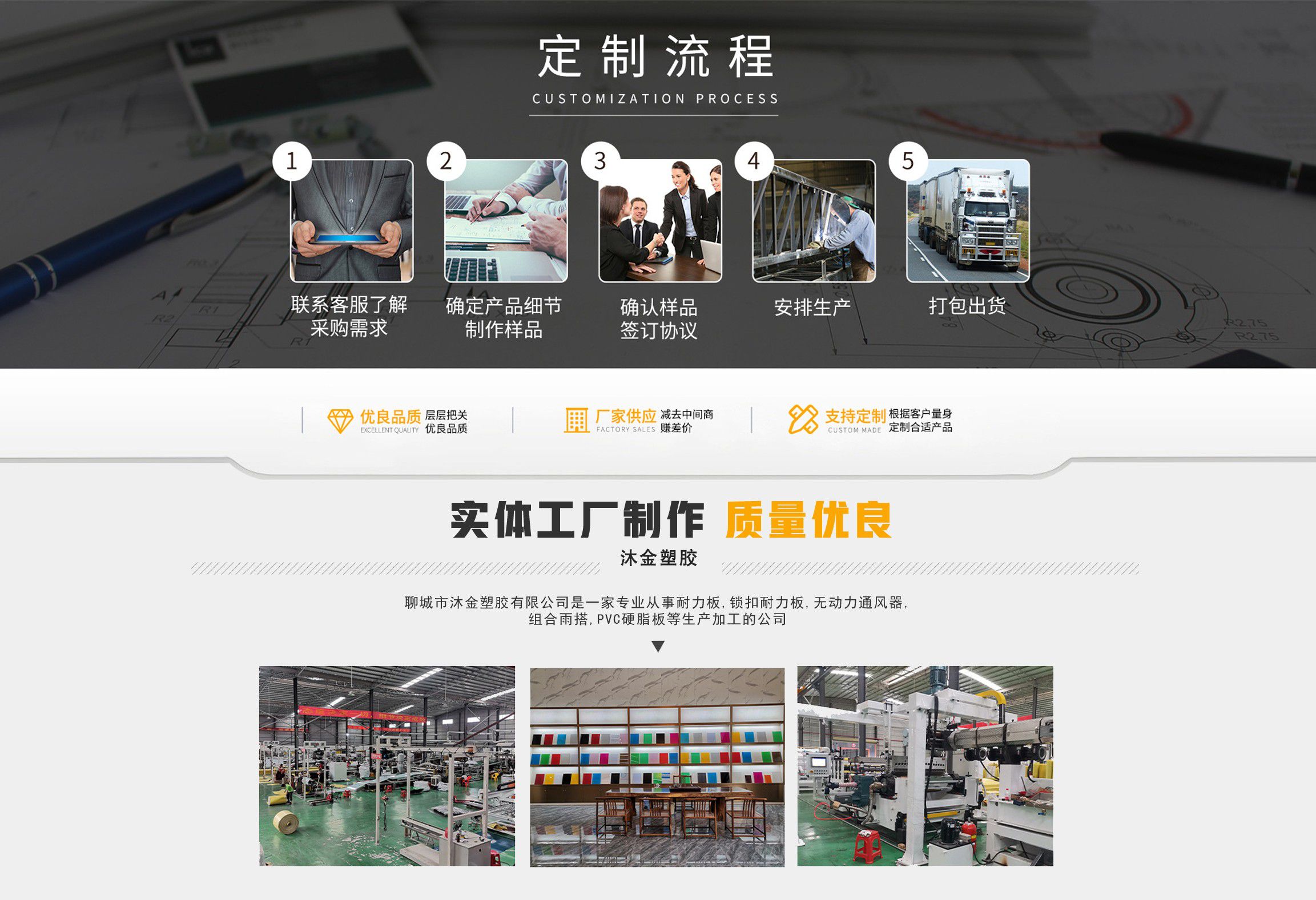 聊城市沐金塑膠有限公司注冊資金2180萬元,占地20000余平方,擁有自建廠房15000平方,員工100余名。10余年來,公司主營耐力板,鎖扣耐力板,耐力板深加工,無動力通風器,組合雨搭,PVC硬脂板,耐力板廠家等板材的發展戰略,逐漸成長為綜合性企業?! 」緭碛卸鄺l板材共擠生產線,采用世界知名品牌進口原材料和先進工藝,依據完善的ISO9001質量管理體系和ISO14001環境管理體系,為產品的卓越品質提供了強有力的保證。憑借過硬的創新能力和堅實的硬件基礎,贏創已成為國內領先的熱塑性板材生產商,產品被廣泛應用于建筑業、農業、工業、廣告業、安防行業及DIY領域?! 」臼冀K致力于通過提供最優的板材應用解決方案,為客戶創造最高的價值;堅守創新、質量、靈活、服務和速度的核心價值觀;堅持“完美的產品需要完美服務的支持”的經營理念,努力實現成為世界領先的板材與解決方案供應商的夢想。 在未來,公司將立足客戶需求,不斷改變和完善現有產品,拓展產品線和充分開發板材的應用領域,為客戶創造全方位的價值。同時更好地實現員工的價值,實現公司團隊的價值。我們將與您一起創贏未來! 企業使命:成為世界領先的板材與解決方案供應商。 公司愿景:通過提供最優的板材應用解決方案,為客戶創造最高的價值?! 『诵膬r值觀:質量...